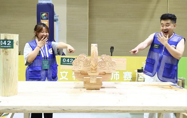 木作文物修复师项目选手张玥和师父王振之与制作的“一斗二升交麻叶”合影。主办方供图