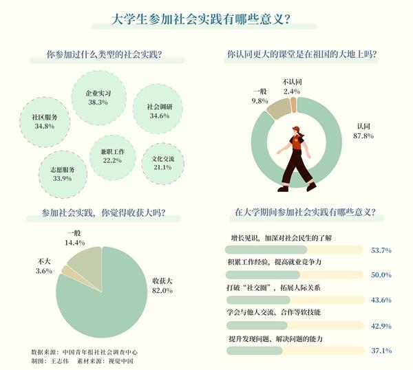 调查显示,87.8%的受访大学生认同,更大的课堂在祖国的大地上。对于参加社会实践的意义,受访大学生把增长见识,加深对社会民生的了解排在首位,获选率为53.7%,积累工作经验,提高就业竞争力(50.0%),打破“社交圈”,拓展人际关系(43.6%)分别排在第二、三位。