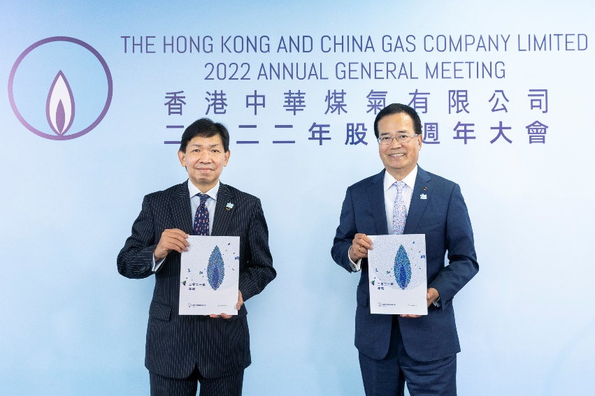 香港中华煤气常务董事暨行政总裁黄维义(图右),香港中华煤气执行董事、首席财务总裁暨公司秘书何汉明(图左)在 2022 年股东周年大会后主持新闻发布会,介绍公司业务前景。