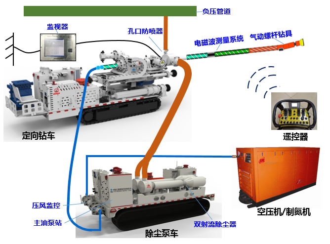 团队通过优化组合形成了碎软煤层氮气排渣气动定向钻进成套装备集成,包括:定向钻机、气动螺杆钻具、制氮机、电磁波随钻测量系统、除尘泵车等。开发形成了碎软煤层氮气排渣气动定向高效钻进技术,该项技术以高压制氮机提供氮气作为气源,驱动气动螺杆钻具工作实现定向钻进、排出煤渣,配套电磁波随钻测量系统实现轨迹精准测量与控制,实现碎软煤层气动定向钻进成孔。