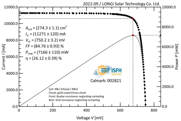 近日,据德国哈梅林太阳能研究所(ISFH)最新认证报告,隆基采用自主研发的掺镓p型硅片制备的硅异质结电池(p-HJT)获得效率新突破:在掺镓p型全尺寸(M6,274.3cm²)单晶硅片上,隆基将硅异质结电池转换效率推高至26.12%。这是迄今为止p型硅电池效率的最高纪录,进一步验证了低成本硅异质结量产技术的可行性。