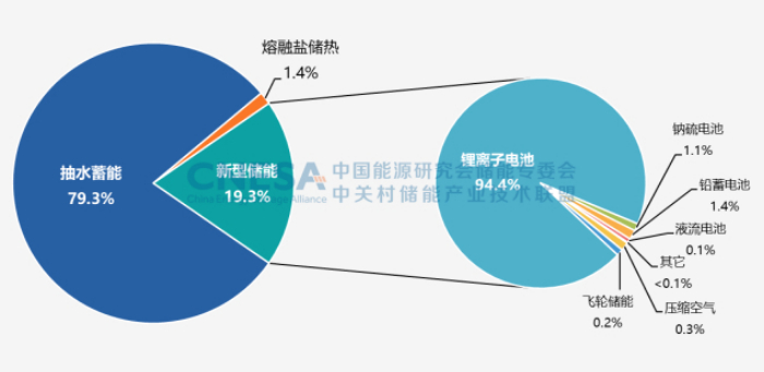 根据中国能源研究会储能专委会/中关村储能产业技术联盟(CNESA)全球储能项目库的不完全统计,截至2022年底,全球已投运电力储能项目累计装机规模237.2GW,年增长率15%。抽水蓄能累计装机规模占比首次低于80%,与2021年同期相比下降6.8个百分点;新型储能累计装机规模达45.7GW,是去年同期的近2倍,年增长率80%,锂离子电池仍占据绝对主导地位,年增长率超过85%,其在新型储能中的累计装机占比与2021年同期相比上升3.5个百分点。