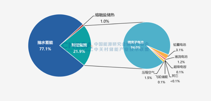 根据CNESA全球储能项目库的不完全统计,截至2022年底,中国已投运电力储能项目累计装机规模59.8GW,占全球市场总规模的25%,年增长率38%。抽水蓄能累计装机占比同样首次低于80%,与2021年同期相比下降8.3个百分点;新型储能继续高速发展,累计装机规模首次突破10GW,达到13.1GW/27.1GWh,功率规模年增长率达128%,能量规模年增长率达141%。