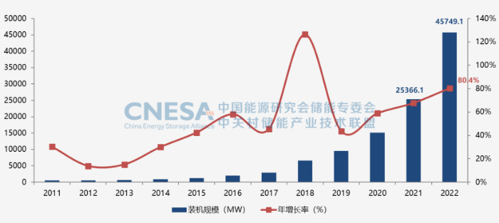 图1:全球电力储能市场累计装机规模(2000-2022)