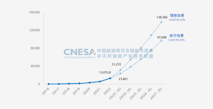 CNESA自2014年起对中国储能市场规模进行预测,本版白皮书中,CNESA基于保守场景(定义为政策执行、成本下降、技术改进等因素未达预期的情形)和理想场景(定义为各省储能规划目标顺利实现的情形)对2023-2027年中国新型储能市场的规模和发展趋势进行预测。