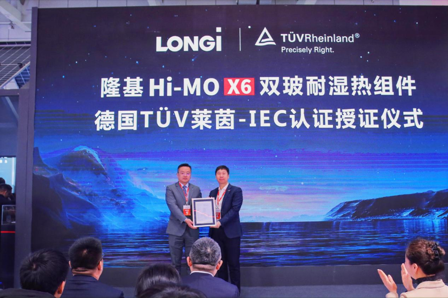 本次新品发布会上,TÜV莱茵大中华区太阳能与商业产品服务光伏组件副总经理冯轶洲为隆基颁发Hi-MO X6双玻耐湿热组件IEC证书,再次印证了该组件的耐湿热和低衰减性能。