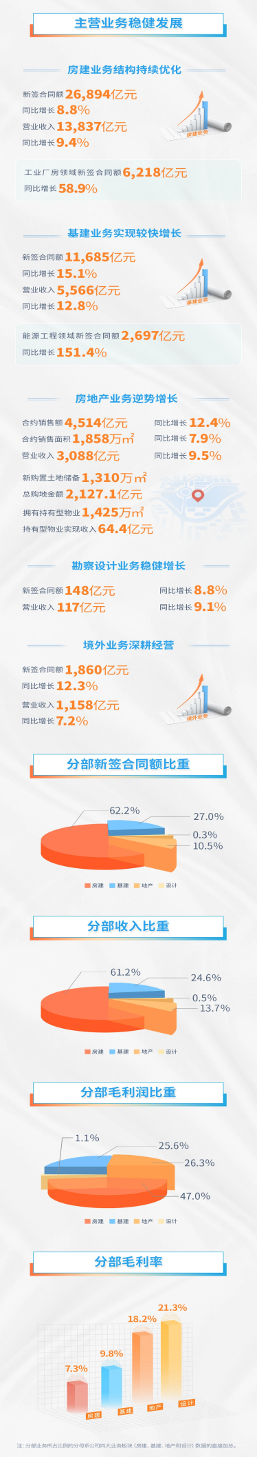 房建业务结构持续优化,新签合同额2.69万亿元、同比增长8.8%;工业厂房、科教文卫体设施、商业综合等公共建筑领域新签合同额占比持续提升;基建业务发力重点领域,新签合同额11,685亿元,同比增长15.1%;市政工程、交通运输工程等领域取得一批重大工程;能源工程、水务及环保、水利水运等领域取得新突破,新签合同额合计占比提升至37.3%;地产业务加快适应新发展模式,中海地产权益销售额位列行业第二,利润率保持行业领先,主要指标稳中有升。坚持聚焦高能级城市的投资布局,全年新购置土地43宗,新增土地储备764万平方米,新增土地货值位列行业第一,购地金额人民币1,342.1亿元。全年实现合约销售额2,670亿元,同比增长4.9%。坚持稳健审慎的财务策略,牢牢把握“三道红线”调控下处于绿档的优势,坚持精益建造,在聚焦加快发展住宅开发主业的同时,推动商业物业、教育养老、物流等业务发展。中建地产积极应对市场变化,丰富土地获取路径和方式,新购置土地59宗,新增土地储备546万平方米,购地金额785亿元;全年实现合约销售额1,844亿元,同比增长25.3%。勘察设计业务稳健增长,夯实传统设计主业,新签合同额148亿元,营业收入117亿元。境外业务坚持深耕运营,全力应对复杂多变的国际形势,持续增强全球资源配置能力。新签合同额1,860亿元,同比增加12.3%,其中建筑业务新签合同额1,755亿元,同比增长15.4%。公司大力实施海外高质量发展战略,积极参与共建“一带一路”国际合作。
