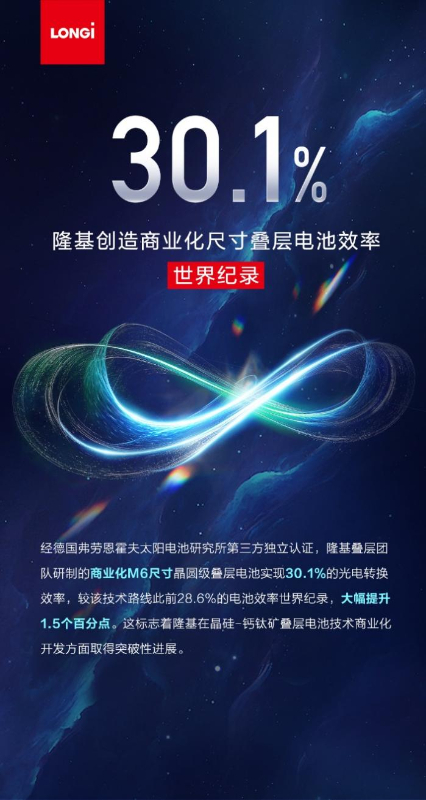 当地时间6月19日,在德国慕尼黑进行的Intersolar Europe 2024展会上,隆基重磅发布晶硅-钙钛矿叠层太阳能电池领域的研发最新进展。经太阳电池领域权威认证机构德国弗劳恩霍夫太阳电池研究所(Fraunhofer ISE)第三方独立认证,隆基叠层团队研制的商业化M6尺寸晶硅-钙钛矿叠层电池实现30.1%的光电转换效率,较该技术路线此前28.6%的电池效率记录,大幅提升1.5个百分点,标志着隆基在晶硅-钙钛矿叠层电池技术商业化应用方面取得突破性进展。