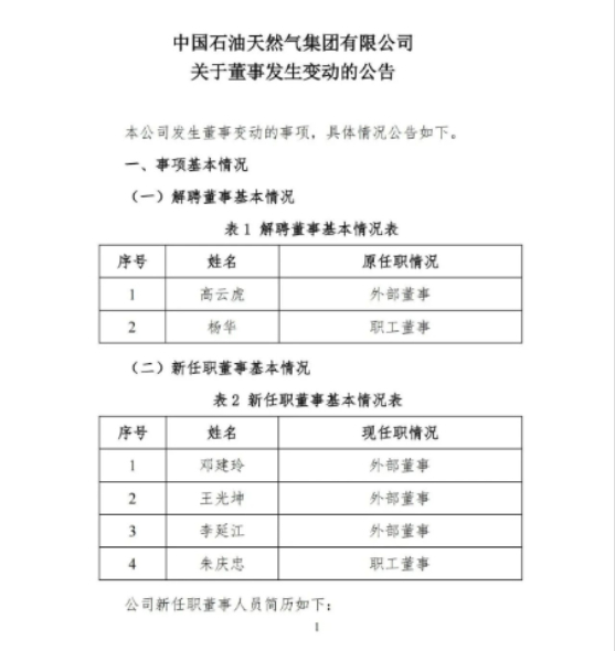 中国石油天然气集团有限公司16日在上交所发布《中国石油天然气集团有限公司关于董事发生变动的公告》,宣布邓建玲正式出任中石油集团外部董事。