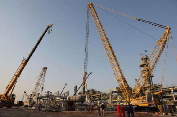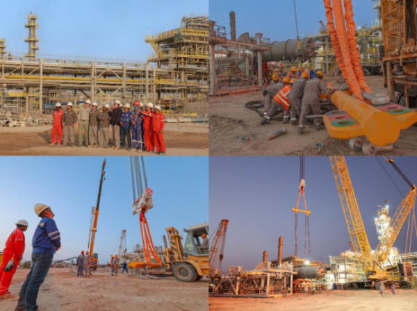 当地时间8月6日17时,油田天然气处理厂施工现场呈现出一派热火朝天、井然有序的繁忙景象。一台600吨重的履带吊车,带着高耸的吊臂缓缓移动、稳步就位,一台200吨的履带吊车也已蓄势待发,随时准备响应指令。