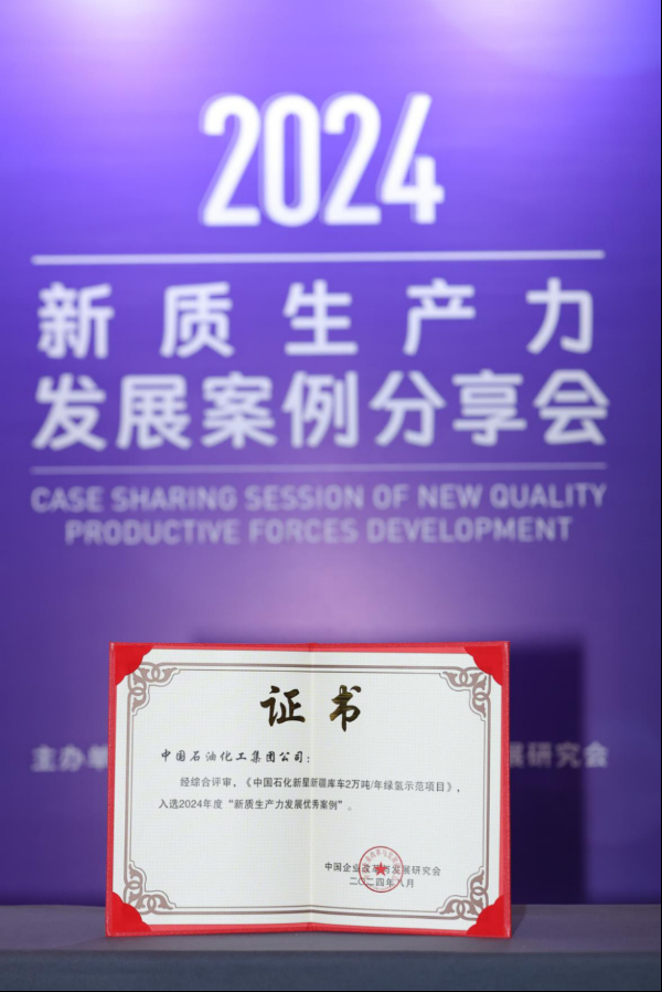 新华网北京8月26日电(张昊哲)8月22日至24日,以“新质生产力:新产业、新模式、新动能”为主题的2024太阳岛企业家年会在黑龙江省哈尔滨市举办。作为年会重磅活动之一,由新华网和中国企业改革与发展研究会联合主办的“新兴向荣 质胜未来——新质生产力发展案例分享会”于23日下午举行。会上,中国石化新星新疆库车2万吨/年绿氢示范项目获评2024年度“新质生产力发展优秀案例”。