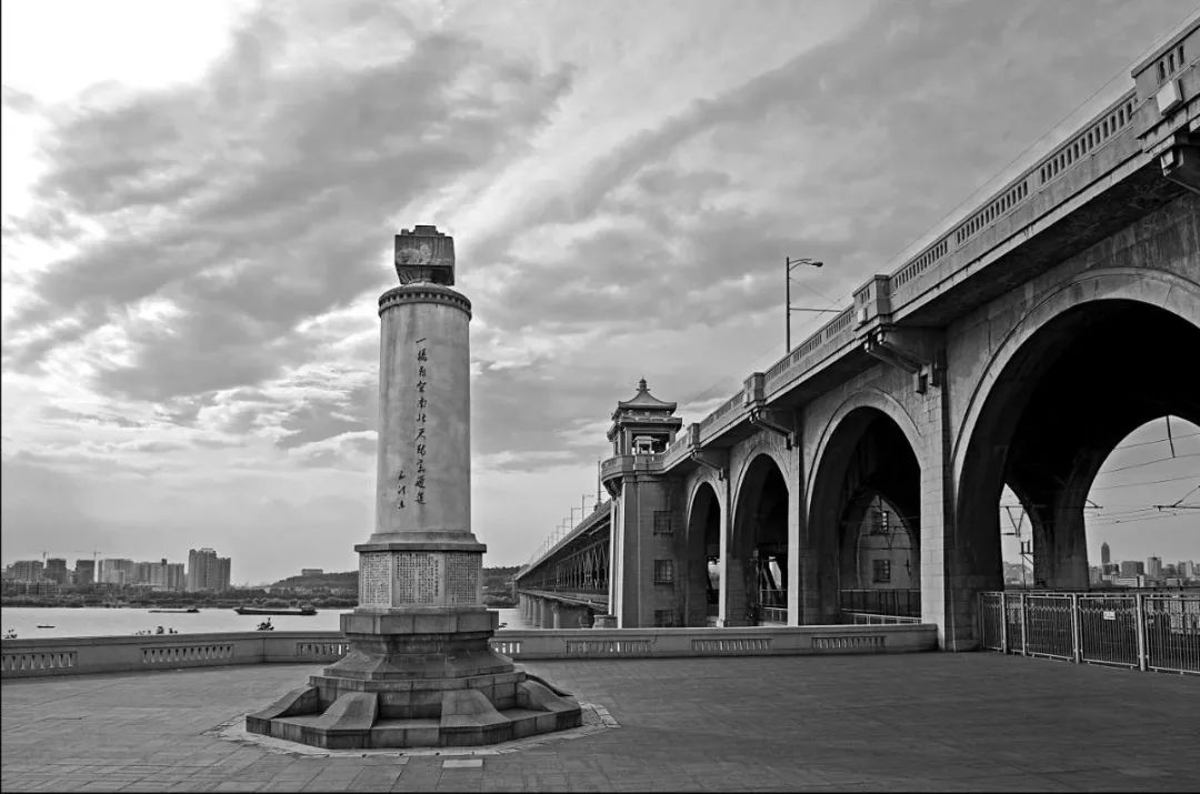 屹立于武汉长江大桥武昌岸桥头的管柱纪念碑