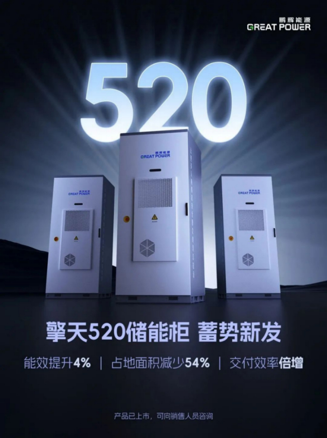 2月14日,开年大吉,鹏辉能源首发2025年重磅储能柜新品“擎天520“。据产品海报信息,擎天520储能柜能效提升4%,占地面积减少54%,通过研发与制造整体架构创新,生产交付效率倍增。