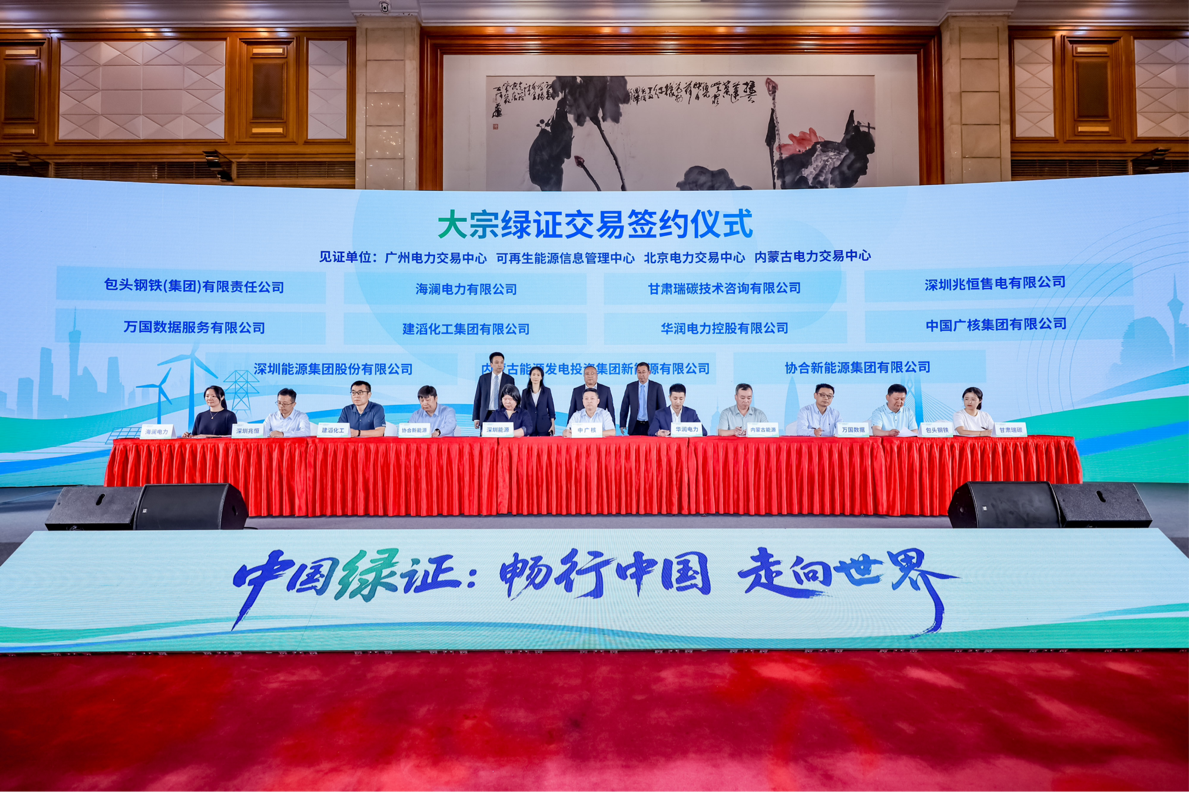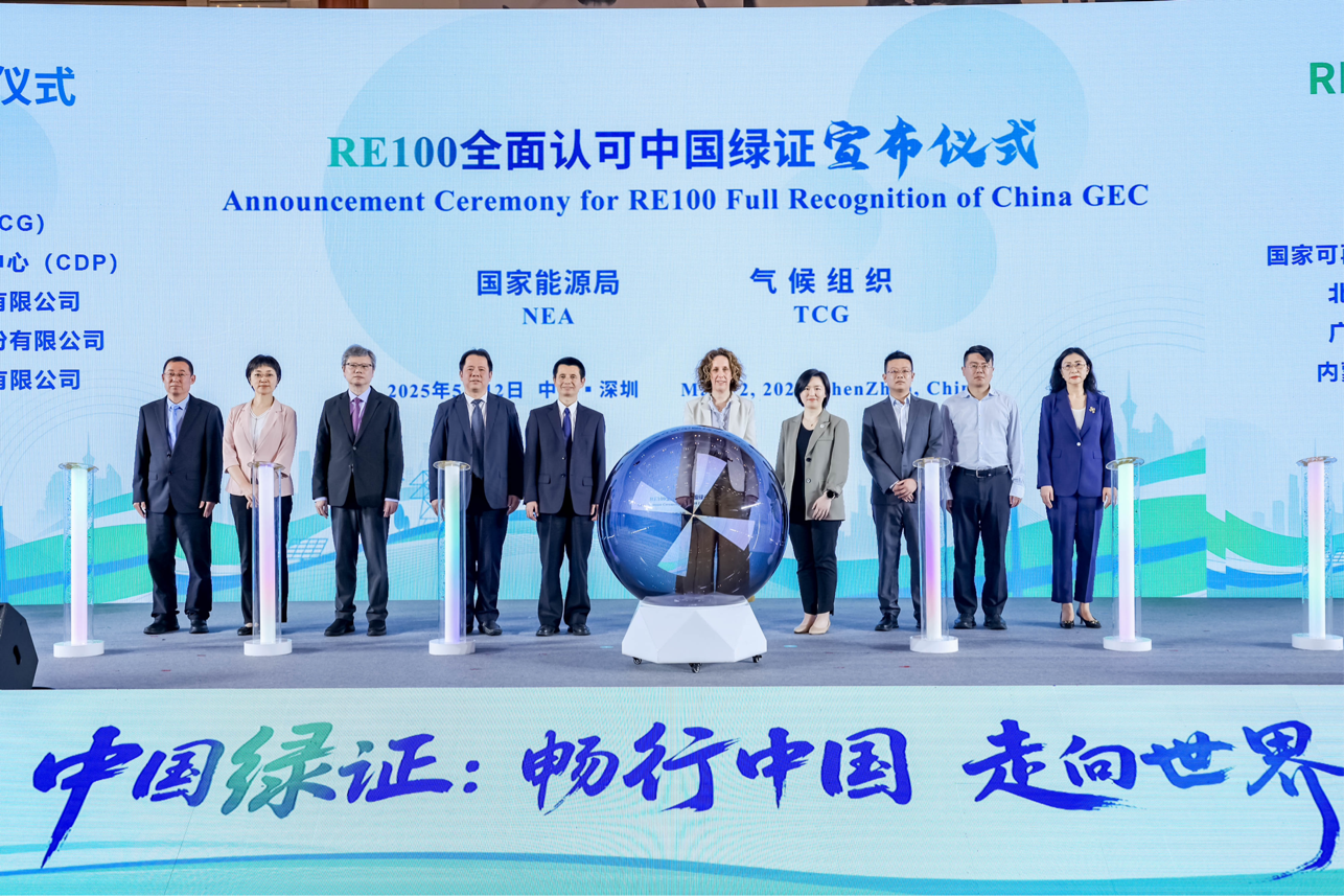 5月12日,“中国绿证:畅行中国 走向世界——绿证走进粤港澳大湾区”活动在广东深圳举行。活动现场举行了全球绿色电力消费倡议(RE100)全面认可中国绿证宣布仪式,发布了2024年粤港澳绿色电力(绿证)消费报告。来自国家能源局、地方政府、电力交易中心、国际组织、粤港澳三地企业及智库等单位的200余位嘉宾出席活动,共商绿证市场高质量发展之路。