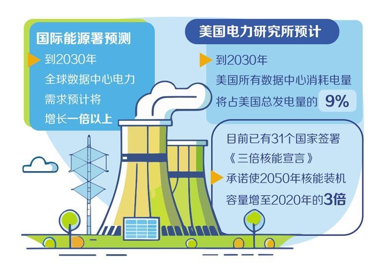 究其原因,一是电力供应成为决定数字经济成败的关键。数字经济特别是人工智能、数据中心等新兴产业发展需要大量电力保障。国际能源署预测,到2030年,全球数据中心的电力需求预计将增长一倍以上,人工智能将成为推动用电激增的最主要动力。美国电力研究所预计,到2030年,美国所有数据中心消耗的电量可能将占美国总发电量的9%,如果没有新的技术创新突破,短期内,核能是少数几个能够迅速满足日益增长电力需求的选项。