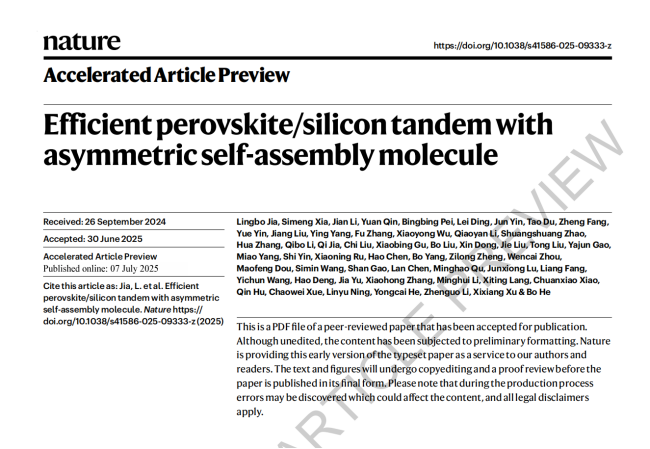 针对空穴传输层所在的界面复合问题,隆基团队联合苏州大学开展研究,在新型有机自组装分子材料(SAM)设计及晶硅-钙钛矿叠层器件取得了突破性进展。有别于传统的SAM材料在咔唑的氮原子上引入膦酸锚定基团,研究人员在咔唑核的苯环侧引入膦酸锚定基团,提出了一种具有非对称结构的自组装分子(HTL201),作为宽带隙钙钛矿子电池的空穴选择层。非对称结构的引入显著增强了SAM的锚定能力,原位提升了SAM在硅绒面衬底的覆盖率及均匀性,优化了界面能级匹配。同时,HTL201与钙钛矿之间的强相互作用促进了高品质钙钛矿薄膜的沉积,并有效钝化了埋底界面缺陷,显著降低了表面界面非辐射复合水平。通过与双面纹理化的异质结晶硅结合,研究团队成功实现了开路电压接近2.0V,且认证效率高达34.6%的晶硅-钙钛矿串联叠层太阳电池。这项研究为新型SAM材料的开发及进一步提升晶硅-钙钛矿叠层效率提供了重要的技术方案。相关研究成果2025年7月7日以“Efficient perovskite/silicon tandem with asymmetric self-assembly molecule”为题,发表于国际顶级学术期刊《Nature》上。