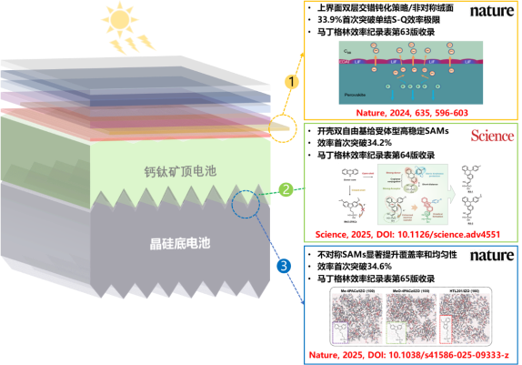 至此,隆基叠层团队已通过发表三篇顶级学术文章,向全行业公开了团队创造的33.9%、34.2%和34.6%三次世界纪录效率(分别收录于马丁格林世界纪录效率表第63版、第64版和第65版)所采用的上界面双层交错钝化策略、D-A型高稳定SAMS材料和不对称SAM型空穴传输材料创制等核心材料和工艺,展现了隆基绿能联合苏州大学、长春应化所等学术机构针对重大关键问题协同创新攻关的校企合作模式,为构建中国叠层电池产、学、研、用良性生态贡献积极的力量。