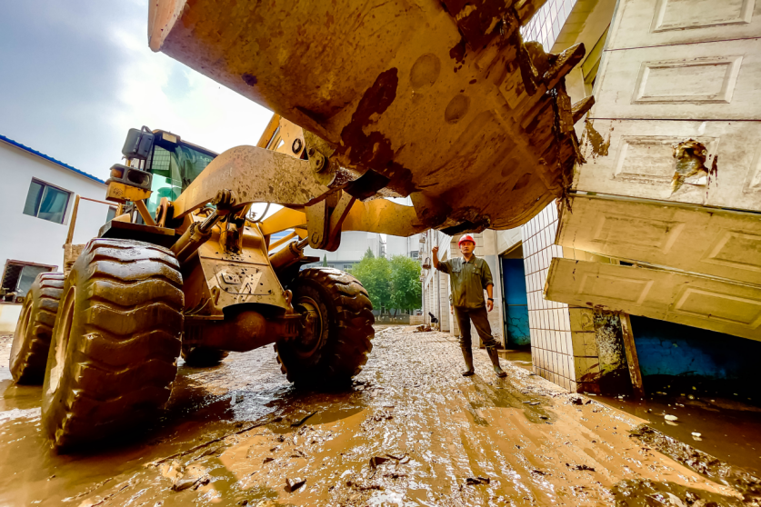7月31日,厂区积水大部排尽,却留下十厘米厚的淤泥。此时天已经转晴,30多度的高温炙烤着大地,淤泥蒸腾起刺鼻的腥臭,却丝毫没有影响到抢险人员的斗志。“一、二,推!”吆喝声此起彼伏,他们穿着雨鞋深一脚浅一脚地清运淤泥。党员突击队踩着腐烂的杂物,用推铲将淤泥铲入下水井,许多人雨鞋里的脚已磨出血泡。挖掘机的轰鸣声、铁锹与地面的摩擦声、潜水泵的抽水声、喷雾嘶嘶的消杀声,在厂区里汇成一首激昂的清淤排涝交响曲。8月2日,厂区淤泥被彻底清除,清出的通道直指复产核心区。