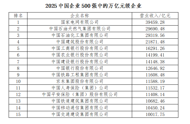 据了解,2025中国企业500强中,有15家企业营业收入超过了万亿元。其中,国家电网营业收入超过3万亿元,即将突破4万亿元大关;中国石油、中国石化、中国建筑的营业收入超过2万亿元。