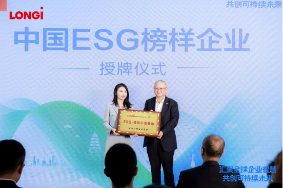 在圆桌会期间,中央广播电视总台财经中心活动部制片人、“中国ESG发布”暨榜样盛典负责人刘星向隆基绿能授予“ESG榜样示范基地”奖牌。