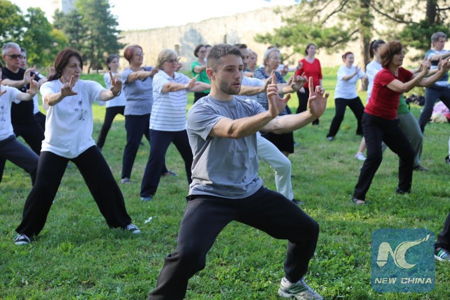 A photo taken on June 9, 2016 show members from Qigong Association of Serbia and Serbian Wushu Association practice Chinese traditional martial arts. (Xinhua/ Wang Huijuan)