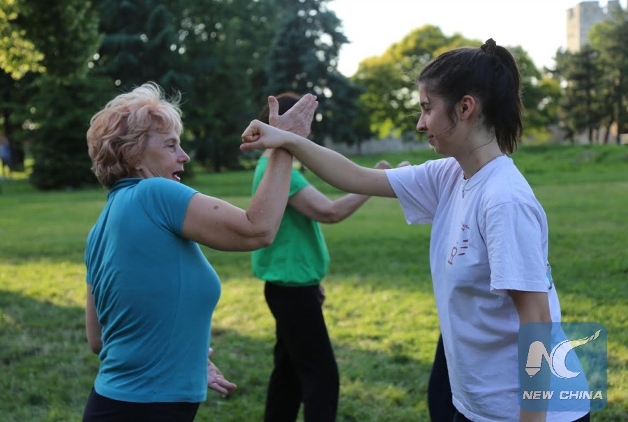 A photo taken on June 9, 2016 show members from Qigong Association of Serbia and Serbian Wushu Association attending an outdoor training session. (Xinhua/ Wang Huijuan)