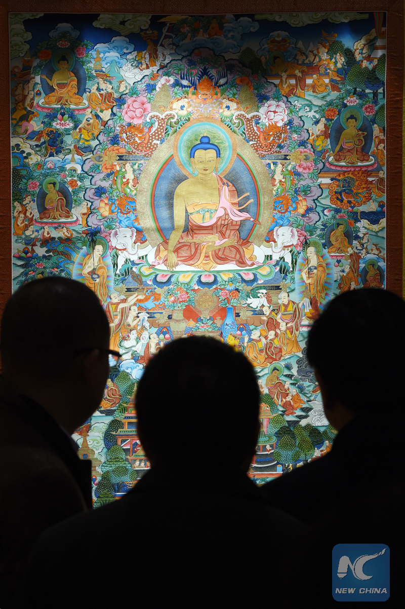 People visit an exhibition of Tibetan thangka painting in Lanzhou, capital of northwest China's Gansu Province, Jan. 18, 2016. (Xinhua/Fan Peishen)
