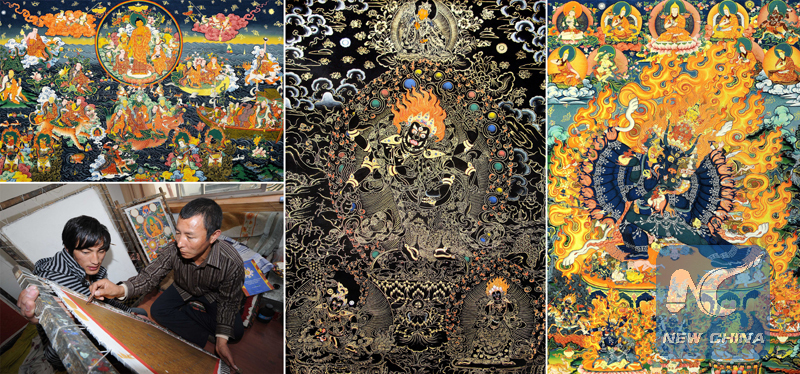 Thangka paintings and a student learning from a thangka master in Lhasa. (Xinhua file photos)