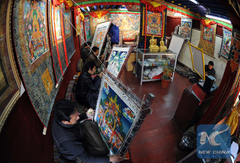 Painters draw thangka at a workshop on Barkhor Street in Lhasa, capital of southwest China's Tibet Autonomous Region. (Xinhua file photo)
