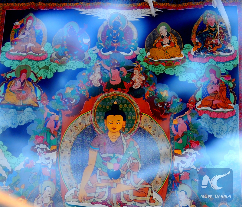 A thangka master is "opening the eyes" for the Buddha on the thangka painting. (Xinhua/Jigme Dorje)