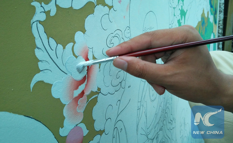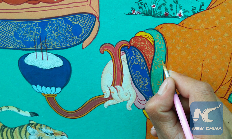 A thangka master is applying colors to flowers. (Xinhua/Jigme Dorje)