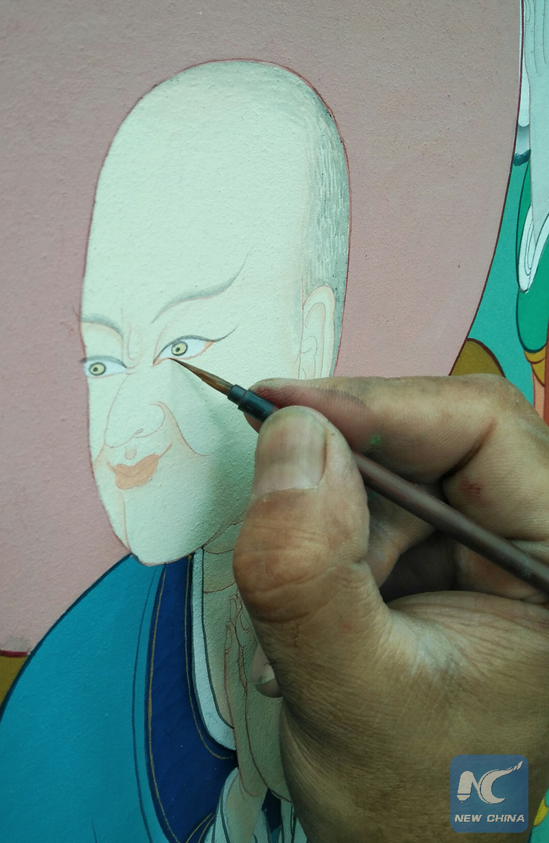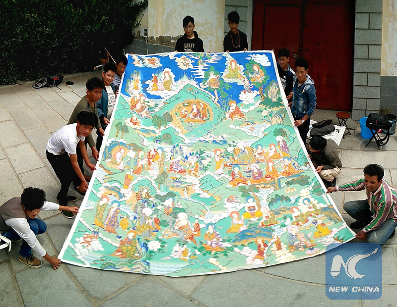 To complete such a huge thangka, it takes one artist at least three months. If three or four artists work together, the time can be shortened to about half a month. (Xinhua/Jigme Dorje)