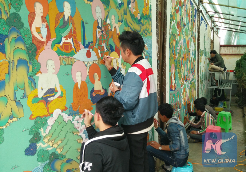 Thangka painters are working together on a huge painting at a workshop in Lhasa, July 20, 2016. (Xinhua/Jigme Dorje)