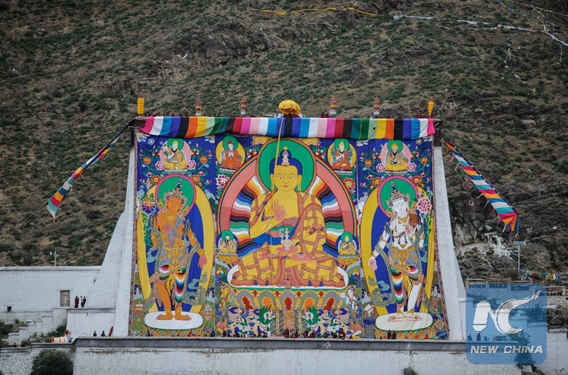 A huge thangka is displayed during the unveiling of the Buddha event at the Zhaxi Lhunbo Lamasery in Xigaze, southwest China's Tibet Autonomous Region, July 20, 2016. (Xinhua/Purbu Tashi)