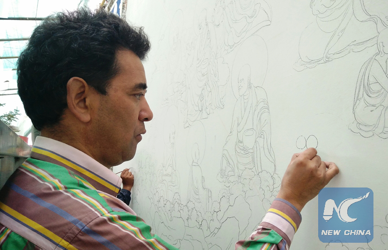 A thangka master is drawing foundational lines of the deities and other figures and objects. (Xinhua/Jigme Dorje)