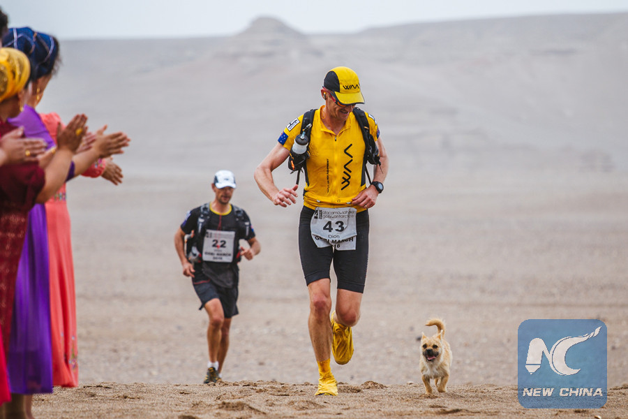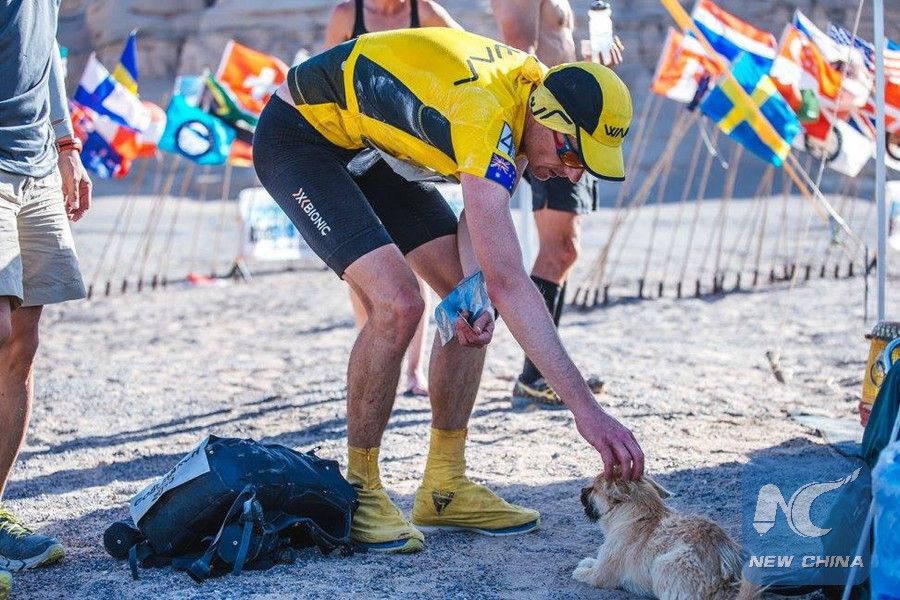 Dion Leonard and stray dog Gobi (4 Deserts/Omni Cai)