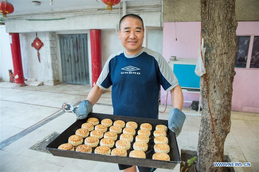 A pastry displays the moon cake after baking at a Chinese restaurant in Cairo, Egypt, Sept. 14, 2016. Moon cake is a Chinese bakery product traditionally eaten during the Mid-Autumn Festival, which falls on the 15th day of the eighth month of the lunar calendar. (Xinhua/Meng Tao)