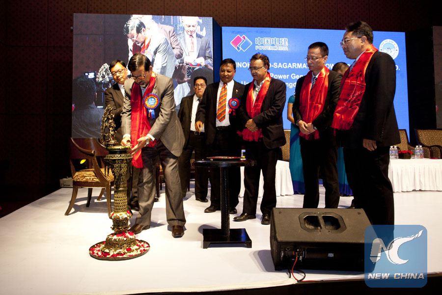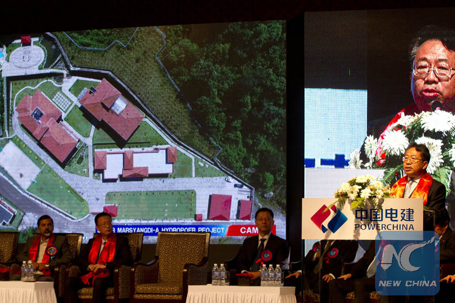 Sheng Yuming (1st R), chairman of Power China Resource, delivers a speech during the "Power Generation Ceremony" of Upper Marsyangdi-A Hydroelectric Project in Kathmandu, Nepal, Sept. 26, 2016. (Xinhua/Pratap Thapa)