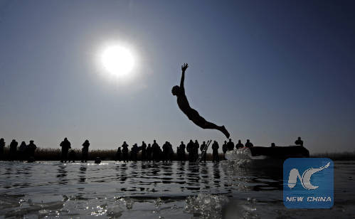 Winter Swimming: In some cities, winter swimmers have made the sport a way of celebration. Photo shows a winter swimming performance in Mingcuihu national wetland park in the city of Yinchuan, northwest China's Ningxia Hui Autonomous Region on Jan.7, 2016 (Xinhua/Wang Peng)