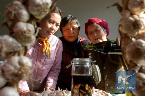 Laba Garlic: Women in east China's Shandong Province show how to make Laba Garlic, which is soaked in vinegar for 20 days starting from the day of Laba. (Xinhua/ Jiang Hao)