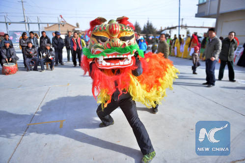 Shehuo is a traditional festive occasion where people sing and dance, mainly in the countryside of north China. Photo shows villagers practicing lion dance in northwest China's Gansu Province to pray for harvest and good weather. The shehuo performance will be continued from Laba to the Lantern Festival. (Xinhua/Fan Peikun)