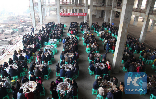 Baba Banquet: More than 600 migrant workers are invited to a banquet by a construction company in southwest China's Sichuan Province on Jan.27, 2016, the day of Laba. (Xinhua/You Qing)