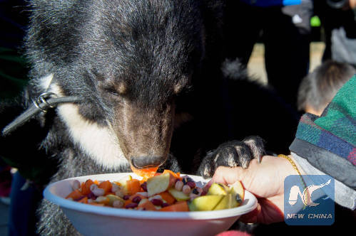 Animals can also have their special food for Laba! A little bear is treated with a mix of fruits and vegetables including carrot, apple and cabbage, in a zoo in southwest China's Yunnan. (Xinhua/Hu Chao)