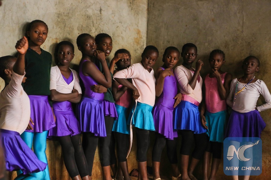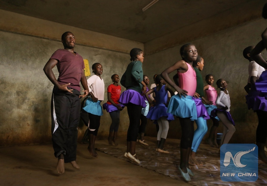 Guided by their coach Michael Wamaya, girls of Spurgeon Child Care Kenya practise ballet dancing during a dancing class in Kibera slums, Nairobi, capital of Kenya, Sept. 17, 2014. In Kenya's giant Kibera slums poverty and crime are wildspread, but youngsters there are getting a chance to realize their potential by learning ballet. (Xinhua/Zhang Chen)