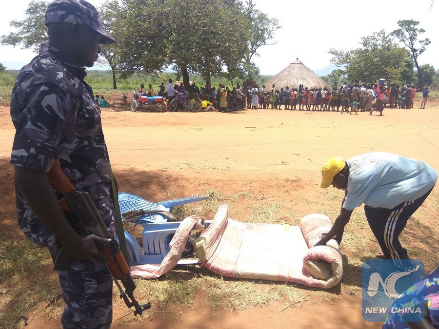 A Ugandan police inspects the belongings of a South Sudanese refugee at Ngomoromo in Lamwo, northern Ugandan, April 12, 2017. Since the start of the year, some 192,000 South Sudanese have fled to neighboring Uganda, a country currently hosting 832,000 refugees from South Sudan, the UN Refugee Agency (UNHCR) reported. (Xinhua/Ronald Ssekandi)