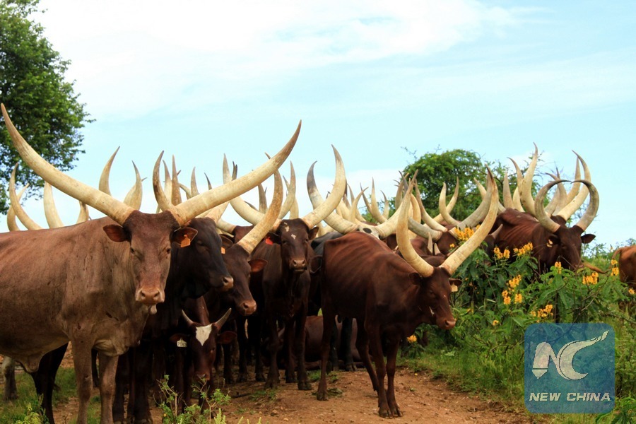 The photo shows a herd of Ankole long-horned cattle, a cattle breed endemic in Africa. (Xinhua/Yuan Qing)