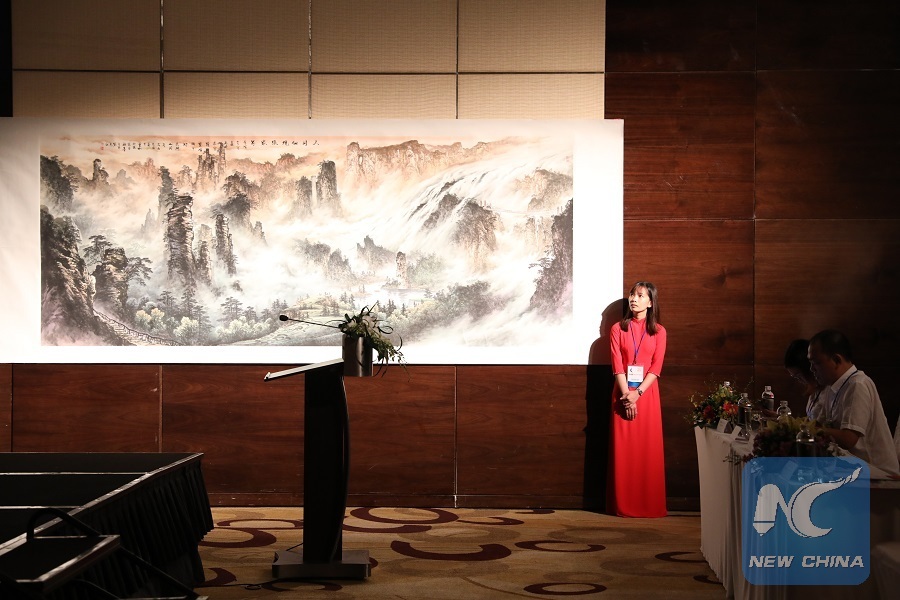 A woman in Vietnamese traditional costume stands before a landscape painting of Zhang Jiajie during the Zhang Jiajie Tourism Promotion Meeting in Hanoi, capital of Vietnam, Jun 20, 2018. (Xinhua/Wang Di)