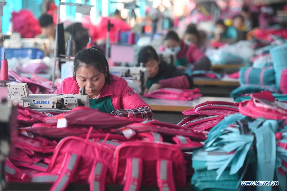 Workers process bags for Israeli market at a bag and luggage company in Fuqing City, southeast China's Fujian Province, Jan. 25, 2019. Production has been in full swing at Xiangxing Group here to meet foreign market demand before the coming Spring Festival holidays. (Xinhua/Song Weiwei)