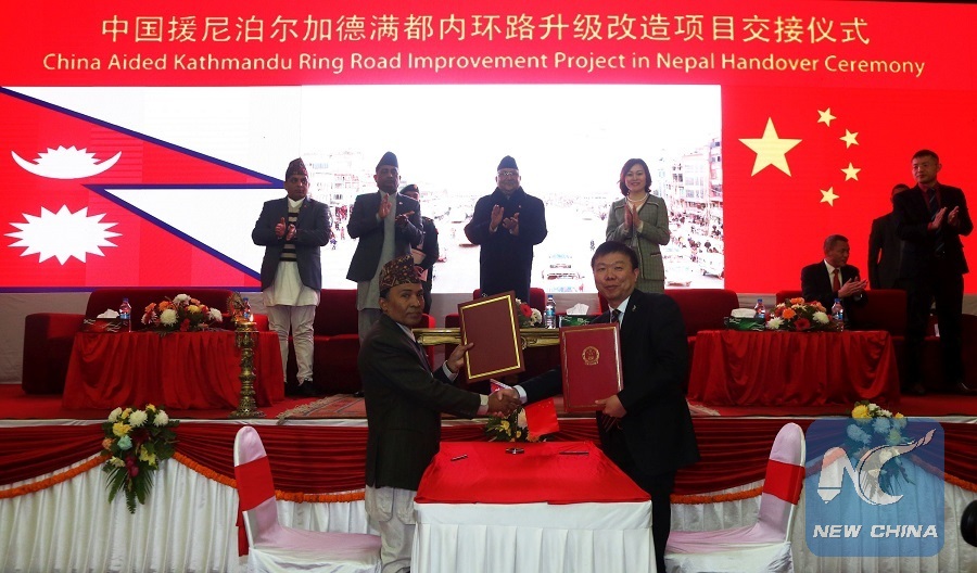 Director General of Nepal's Road Department Rabindranath Shrestha (L) and Commercial Counselor of Chinese Embassy Zhang Fan (R) shake hands after signing documents in presence of Nepali Prime Minister KP Sharma Oli and Chinese Ambassador to Nepal Hou Yanqi during the handover ceremony of China-Aid Kathmandu Ring Road Improvement Project in Kathmandu, Nepal, on Jan. 28, 2019. (Xinhua/Sunil Sharma)