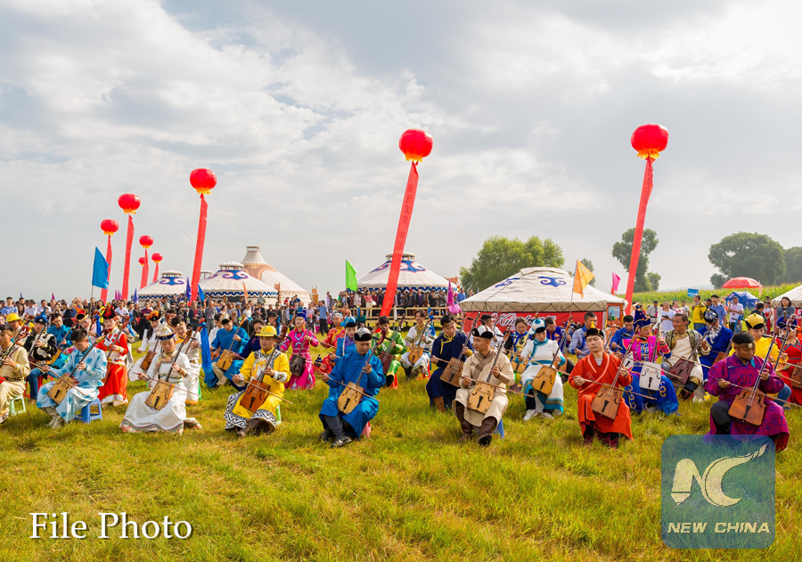 Actors perform matouqin, a bowed stringed instrument with a scroll carved like a horse's head used by the people of Mongolian ethnic group, during a Nadam fair in Hohhot, capital of north China's Inner Mongolia Autonomous Region, Aug. 31, 2017. (Xinhua/Ding Genhou)